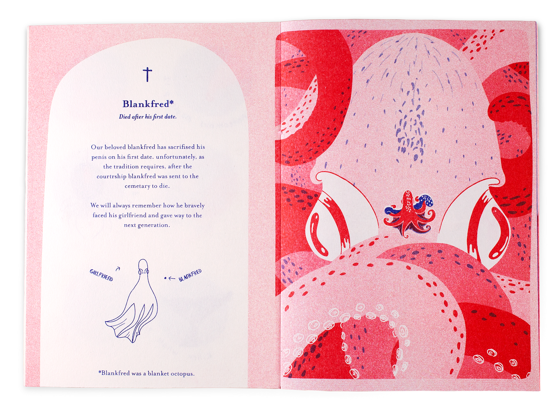 The zine tells short stories about real life examples where females overpower the males - wether it's by being 10 times larger in size or significantly outliving them. We wanted to show that the male being the stronger party is not always the case in the natural world.